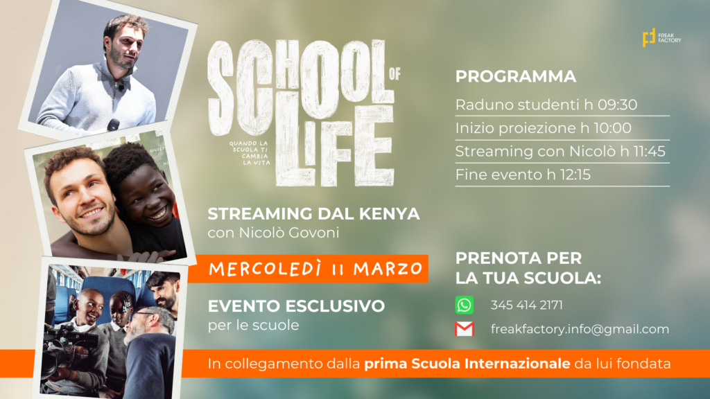 Ma c’è di più! Le scuole di tutta Italia potranno vivere lo stesso evento organizzando la proiezione nel cinema più vicino aderente all’iniziativa, e dopo la proiezione ci sarà il collegamento live con Nicolò Govoni in diretta dal Kenya.
